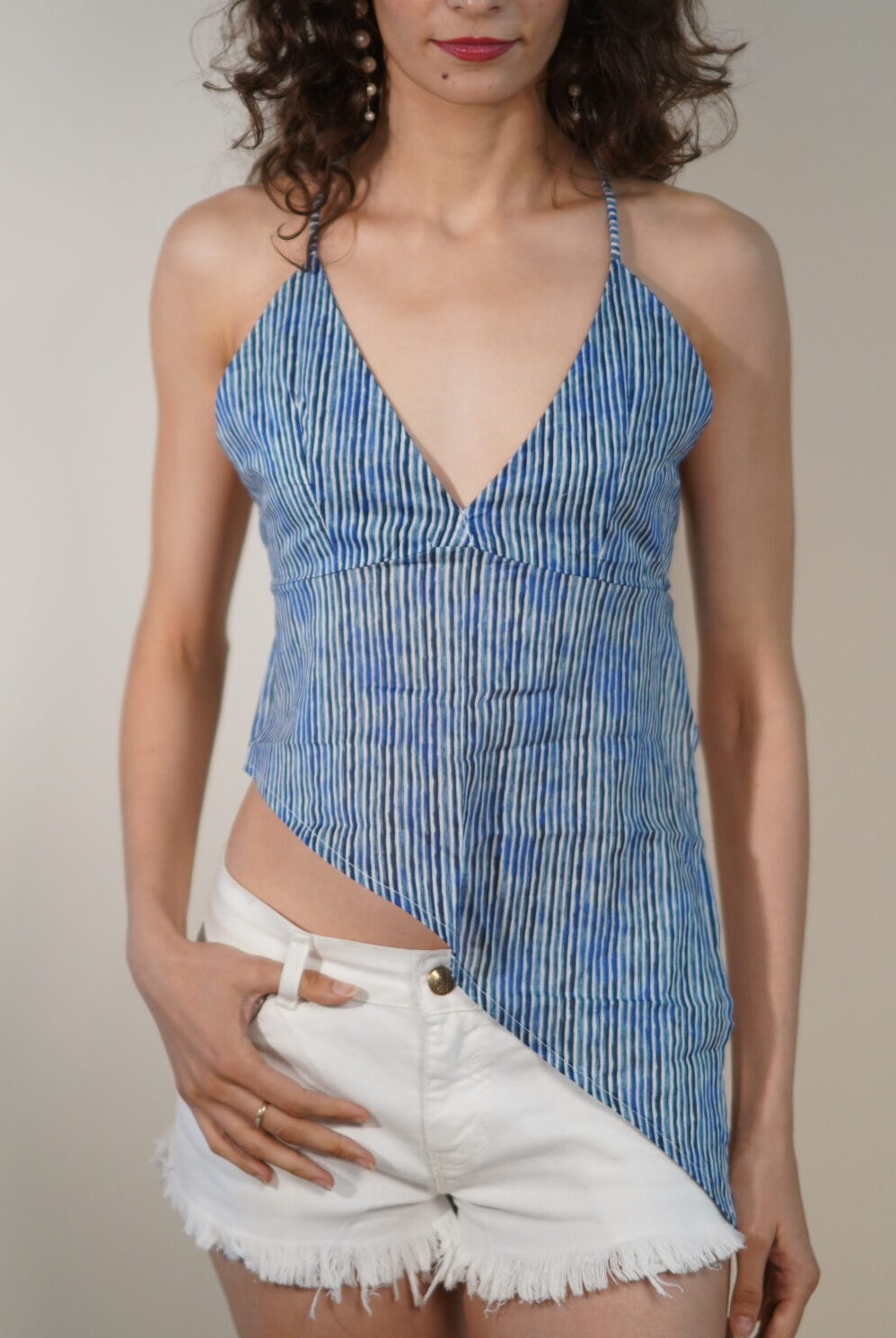 Crafted in soft, breathable cotton, this blue striped top blends effortless comfort with a sharp, modern silhouette. The asymmetrical hemline adds fluid movement and edge, while the deep V neckline keeps it flattering and feminine without trying too hard.