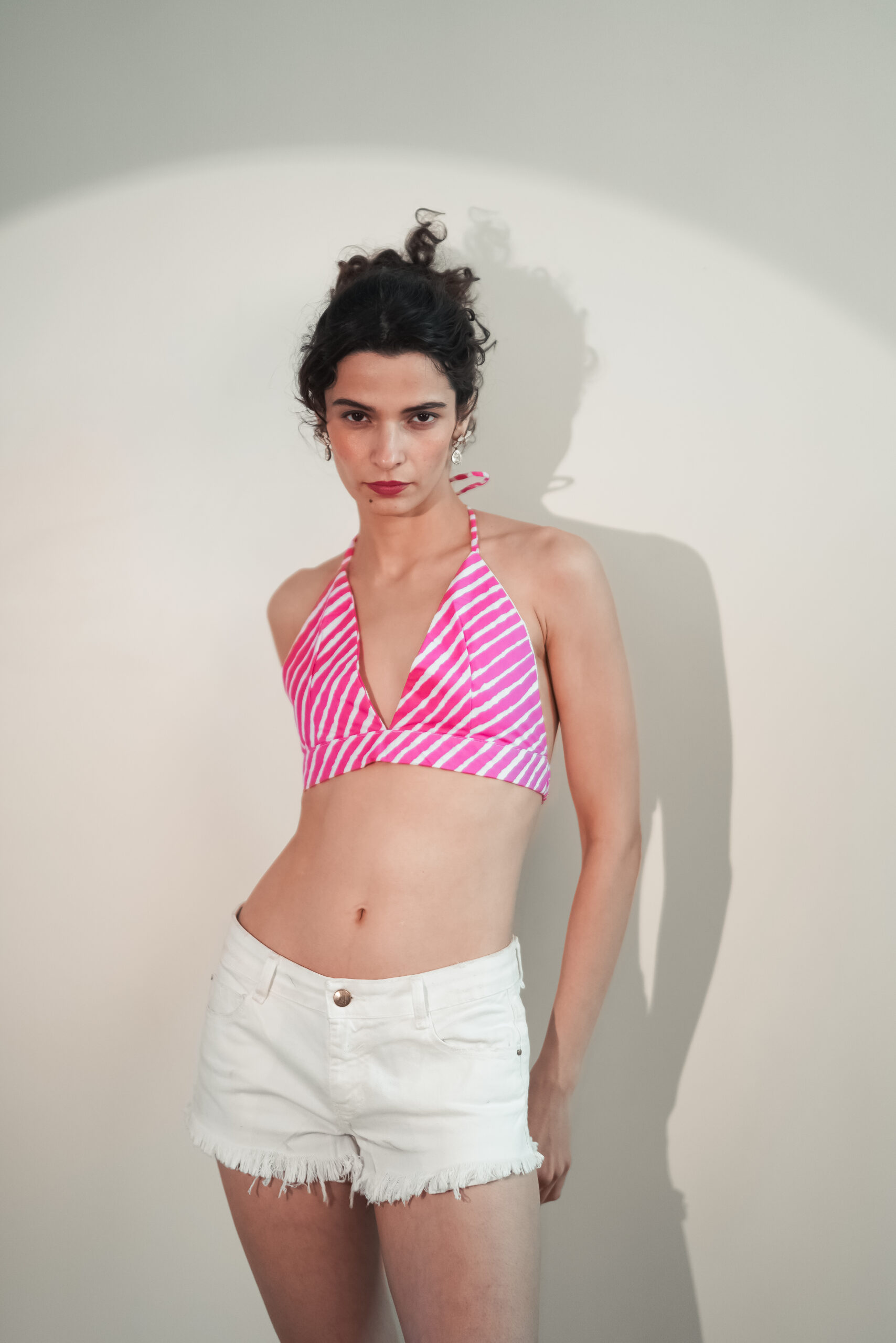 This halter-style bralette is crafted in soft, breathable cotton and features a cheerful pink-and-white striped print that feels fresh and flirtatious. The deep V neckline creates a flattering shape, while the structured underband offers comfort with a clean, minimal finish.
