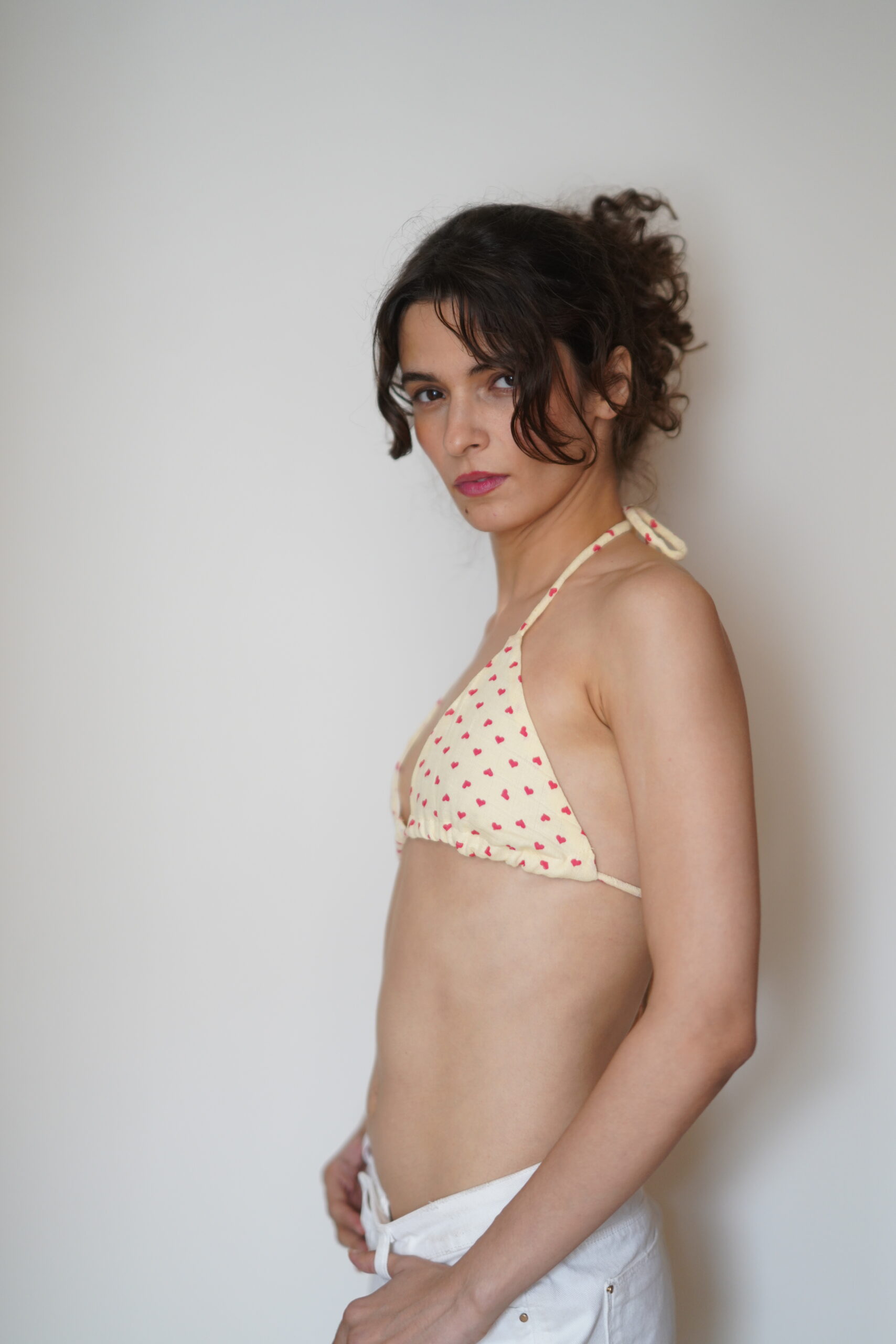 This triangle bralette is crafted in soft, breathable cotton and features a delicate all-over heart print that feels playful yet intimate. The classic halter silhouette with a deep V neckline creates a natural, flattering shape, while the gathered cups add a gentle softness to the fit, perfect for your Goa trip.