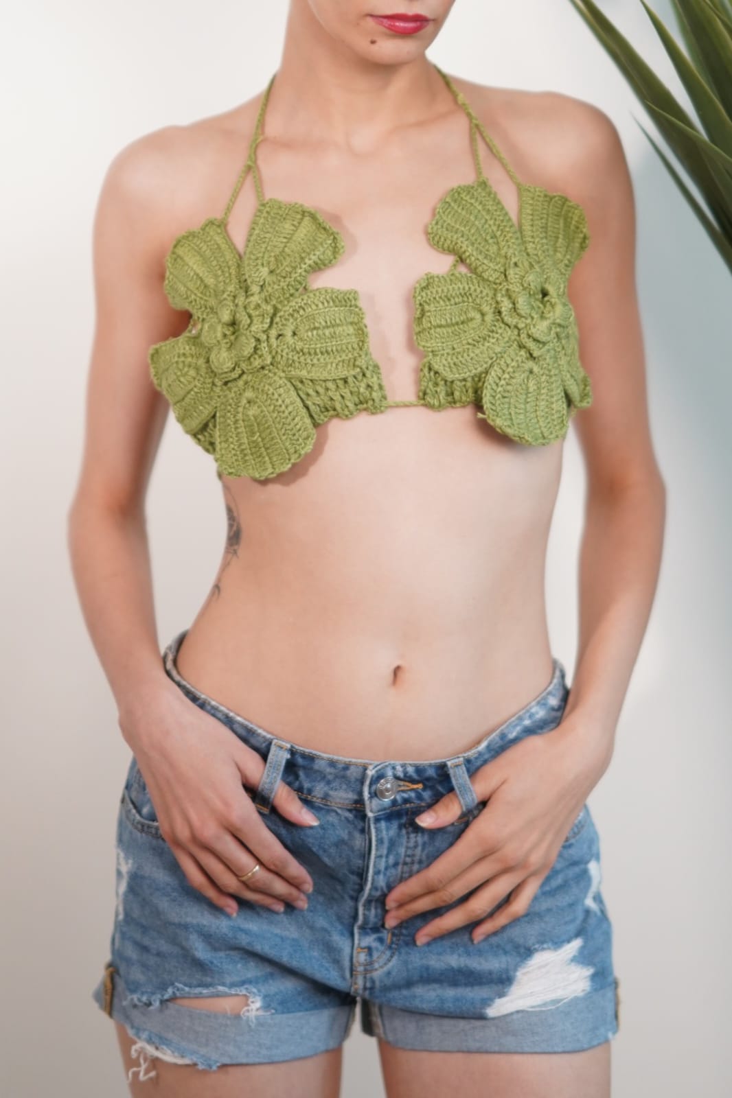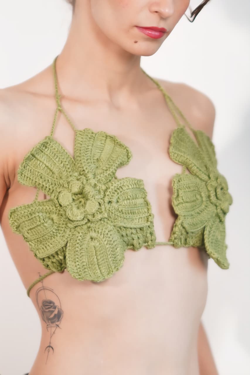 Hand-crocheted in a muted olive green, this bralette draws inspiration from nature, softness, and strength. The oversized floral crochet cups sculpt the body beautifully, creating a statement silhouette that feels organic yet bold.